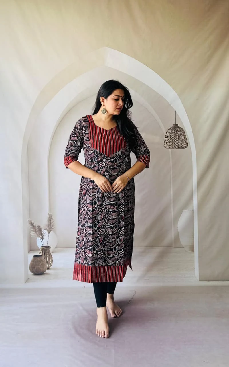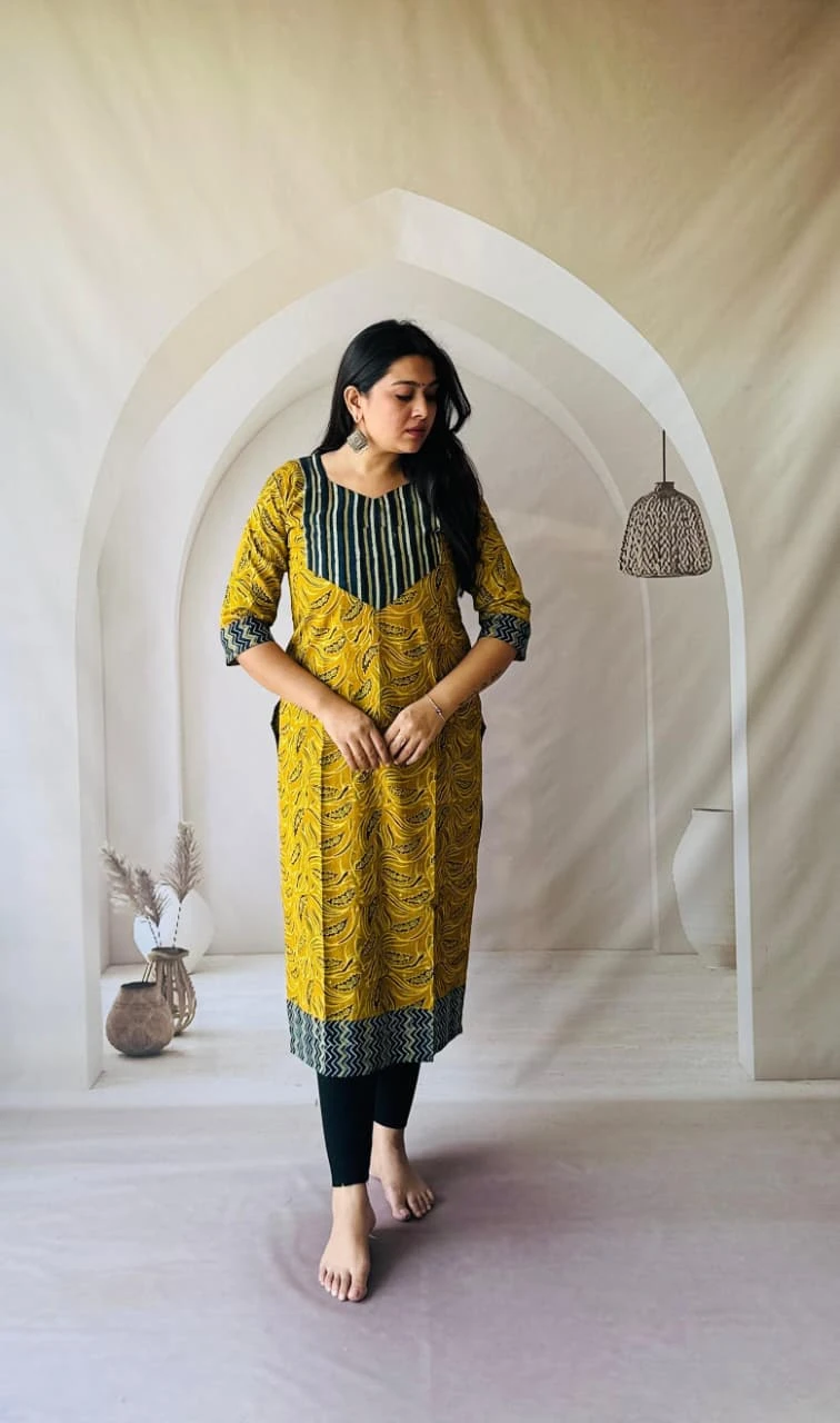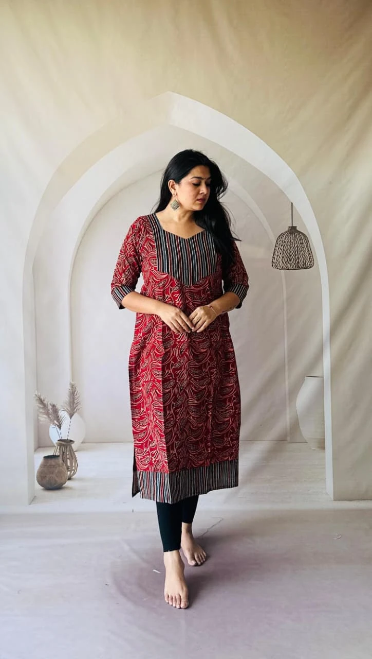 Embrace timeless elegance with our Handblock Print Pure Natural Dye Cotton Straight Kurti, crafted from 100% pure cotton and adorned with exquisite handblock prints. Each piece is naturally dyed, giving it an authentic earthy charm and skin-friendly comfort.